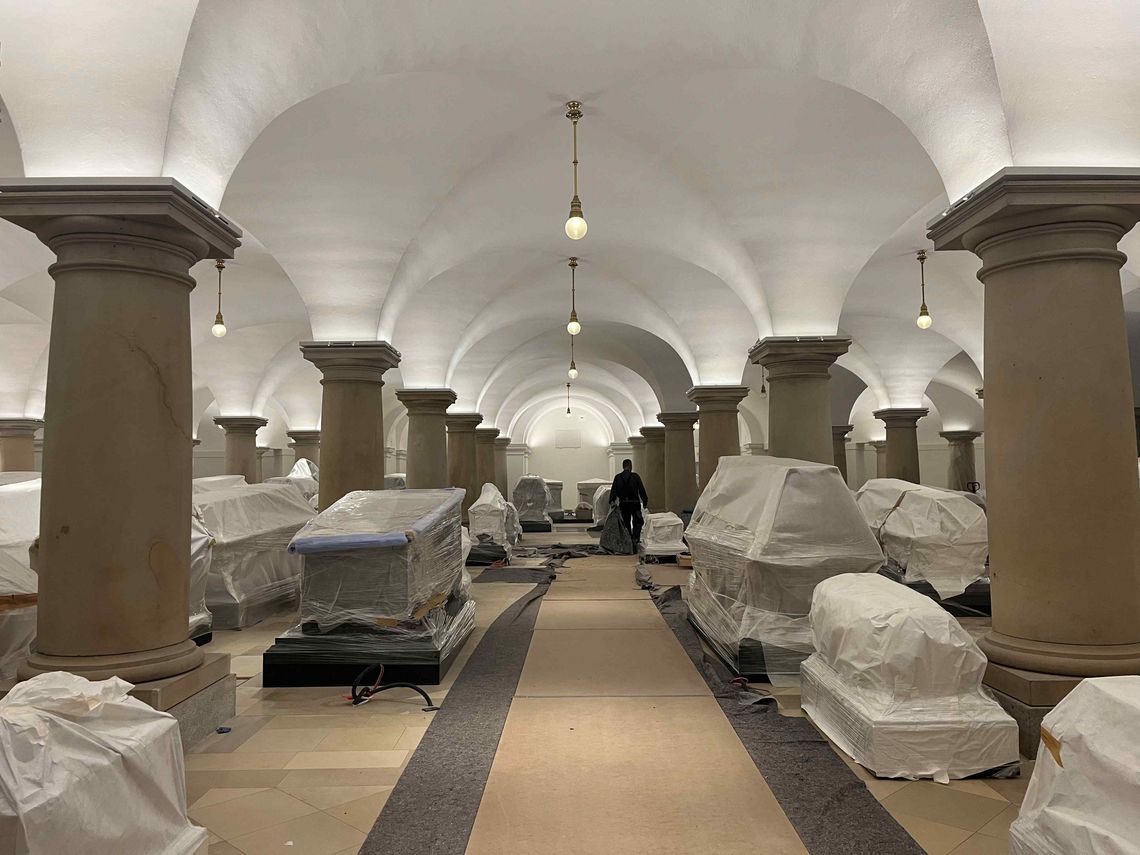 Zu Beginn der Baumaßnahmen mussten die 90 Särge zum Schutz vor Baustaub und Erschütterungen temporär ausgelagert werden. Für die Maßnahme wurden Firmen herangezogen, die langjährige Erfahrungen im Bereich des Transportes und der Einlagerung bedeutender Kultur- und Kunstgüter aufweisen. Die Betreuung durch die Bauleitung eines erfahrenen Restaurators sicherte den fachgerechten Umgang zusätzlich.
